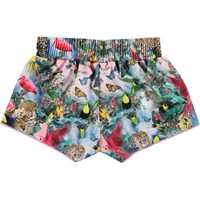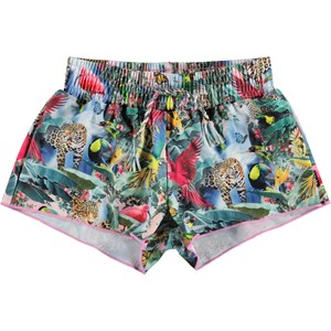 Get a tast of South America and the world's largest rainforest in the 'Wild Amazon' print with a lot of wild animals on the short Nicci swim trunks. They have an elastic waist with ties. Wear the trunks with a matching top for a cool surfer look. Molo's swimwear has 50+ UV protection. The product is CE-marked and tested according to standard EN-13758-1.