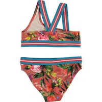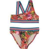 Nicola is an asymmetrical bikini in the 'Australian Flowers' print. It has wide, striped straps and an edge tape in blue, rose and red. The top has crossed straps on the back. Molo's swimwear has 50+ UV protection. The product is CE-marked and tested according to standard EN-13758-1.