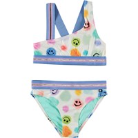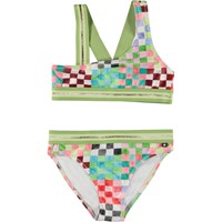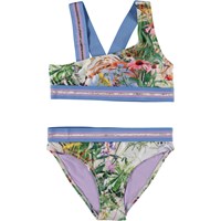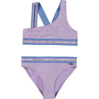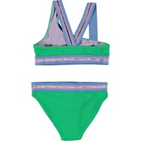 Asymmetrical, sporty bikini in green with a beautiful texture and thin, gold threads running through the fabric. The bikini has wide elastic straps in purple and gold that cross on back. The bottoms are in a regular fit and have the same wide elastic at the waist. Molo's swimwear has 50+ UV protection.