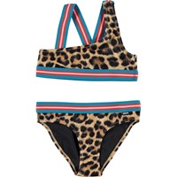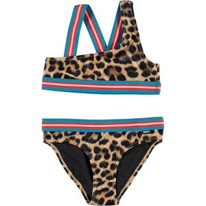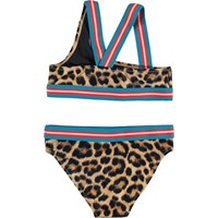 Nicola is an asymmetrical bikini in a leopard print. It has wide, striped straps and an edge tape in blue, rose and red. The top has crossed straps on the back. Molo's swimwear has 50+ UV protection. The product is CE-marked and tested according to standard EN-13758-1.