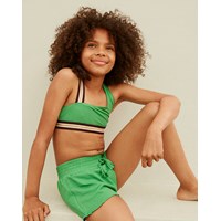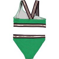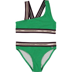 Nicola is an asymmetrical, sporty bikini in a gorgeous green colour. The bikini has wide, striped straps and edging in gold and bordeaux. The straps cross on the back of the top. Molo's swimwear has 50+ UV protection.
