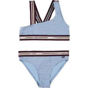 Nicola is an asymmetrical, sporty bikini in a lovely light blue colour. The bikini has wide, striped straps and edging in gold and bordeaux. The straps cross on the back of the top. Molo's swimwear has 50+ UV protection.