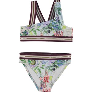 Nicola is an asymmetrical, sporty bikini in light blue with a print of berries and flowers. The bikini has wide, striped straps and edging in gold and bordeaux. The straps cross on the back of the top. Molo's swimwear has 50+ UV protection.