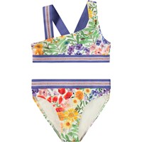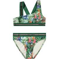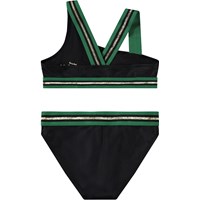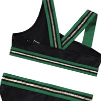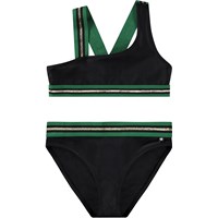 Asymmetric sporty bikini for active children, made from recycled polyester with UV protection 50+. The bikini features a wide top with broad elastic straps that cross at the back, as well as an elastic at the bottom to help keep the top in place. The bottom has a wide elastic waistband, a regular fit, and is fully lined. The bikini is black with green and gold glitter straps. The product is CE-marked and tested according to standard EN-13758-1.