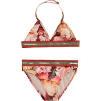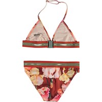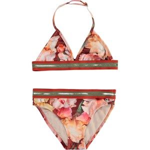 Nicoletta is a halter neck string bikini with an iris flower print in shades of red. The bikini has a golden edge tape with green and red stripes. Molo's swimwear has a UV protection of 50+. The product is CE-marked and tested according to standard EN-13758-1.