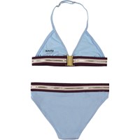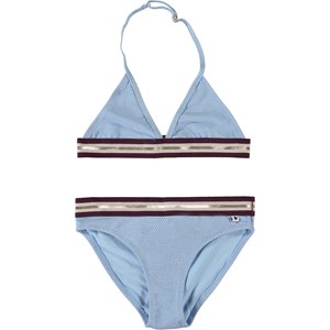 Nicoletta is a halterneck, triangle top bikini in a wonderful light blue colour. The bikini has a golden striped edge on the top and bottoms. Molo's swimwear has 50+ UV protection. The product is CE-marked and tested according to standard EN-13758-1.