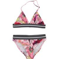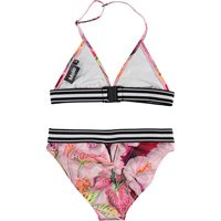 Nicoletta is a halter neck, triangle bikini in pink in a flower print. The bikini has a contrast edge tape with stripes. The bikini has a 50+ UV protection. The product is CE-marked and tested according to standard EN-13758-1.