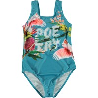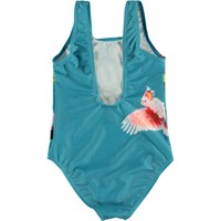 Nika is a classic swimsuit with wide shoulder straps in blue in a bird and flower print with 'Poetry' text. Molo's swimwear has 50+ UV protection. The product is CE-marked and tested according to standard EN-13758-1.