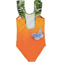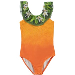 Nika is an orange coloured swimsuit that looks like an orange. The suit has a wide green edge over the shoulders with a floral print. Molo's swimwear has 50+ UV protection. The product is CE-marked and tested according to standard EN-13758-1.