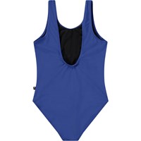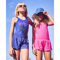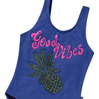 Swimsuit for active children in recycled polyester with UV protection 50+.The swimsuit has a regular fit, a deep back, and is fully lined.It is dark blue with a pearl embroidery of a green pineapple and the text 'Good Vibes'. The product is CE-marked and tested according to standard EN-13758-1.