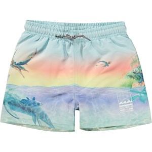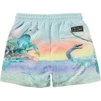 Swim shorts in pastel colours with a placement print of a tropical island with various dinosaurs that are on land, in the sea and in the air. The swim shorts are in 100% recycled polyester and have short legs. They have elastic and ties at the waist and a white Molo Swim label on the front as well as a practical back pocket. The swim shorts are in a regular fit. Molo's swimwear has 50+ UV protection. The product is CE-marked and tested according to standard EN-13758-1.