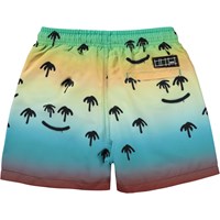 Swim shorts in shades of yellow, blue and green with a black print of spray painted palm trees, where some of them are happy emojis. The swim shorts have short legs, elastic and ties at the waist and a black Molo Swim label on the front. They have a practical back pocket and are in a regular print. Molo's swimwear has 50+ UV protection. The product is CE-marked and tested according to standard EN-13758-1.