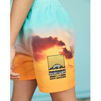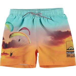 Niko is a pair of sporty swim shorts that are turquoise on top and orange on the bottom with a print of skydivers. Niko has an elastic waist with ties to ensure a comfortable fit. Wear them with a matching t-shirt. Molo's swimwear has 50+ UV protection.