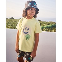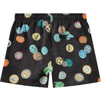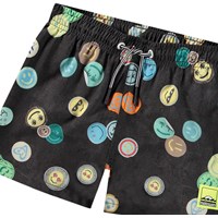 Sporty swim shorts for active children in recycled polyester with UV protection 50+. The swim shorts have a loose fit, reach mid-thigh, have a simple back pocket, elastic waistband with drawstring, and soft mesh inner shorts. The swim shorts are black with a colourful all-over print of smiling faces. The product is CE-marked and tested according to standard EN-13758-1.