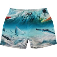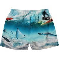 Niko is a pair of sporty swim trunks with a print of stingrays under the ocean''s surface and a surfbaord on top. Niko has an elastic waist for a good, comfortable fit. Wear the trunks with a matching t-shirt. Molo''s swimwear has a UV protection of 50+. The product is CE-marked and tested according to standard EN-13758-1.