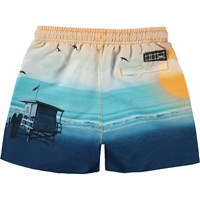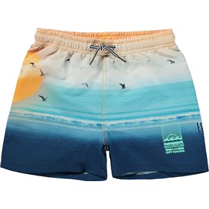 Swim shorts with a placement print in shades of blue and orange in 100% recycled polyester. The print is of a beach at sunset. The swim shorts have short legs, elastic and ties at the waist and a blue Molo Swim label on the front. They have a practical back pocket and are in a regular fit. Molo's swimwear has 50+ UV protection. The product is CE-marked and tested according to standard EN-13758-1.