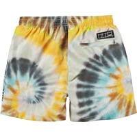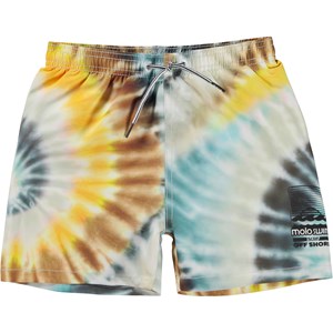 Niko is a pair of sporty swim shorts in a print of colourful tie-dye spirals. Niko has an elastic waist with ties to ensure a comfortable fit. Wear them with a matching t-shirt. Molo's swimwear has 50+ UV protection.