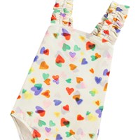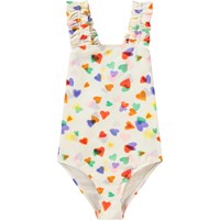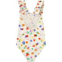 Swimsuit for active children with UV protection 50+. The swimsuit has a regular fit, wide straps that cross at the deep back, and is fully lined. It is white with a colourful heart print all over. The product is CE-marked and tested according to standard EN-13758-1.