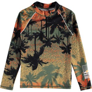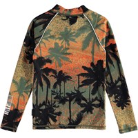 Noble is a rash guard t-shirt with a sporty look and long sleeves. This t-shirt is in a colourful print of palm trees and a sunset with a black zipper at the neck and with white piping. The rash guard offers protection against the sun's rays. The top is thin and comfortable to wear because it is easy to move around in. Mix and match the top with a pair of swim trunks for a cool surfer look. Molo's swimwear has a UV protection of 50+. The product is CE-marked and tested according to standard EN-13758-1.
