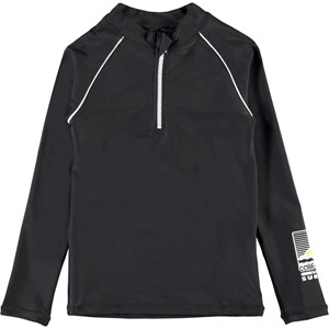 Noble is Molo's new UV rashguard with a sporty look and long sleeves. This Noble style is in black with a white zipper at the neck and with white piping. It protects against the sun's harmful rays. The top is lightweight and comfortable and easy to move around in. Wear it with matching shorts for a cool, surfer look. Molo's swimwear has a UV protection of 50+. The product is CE-marked and tested according to standard EN-13758-1.