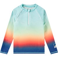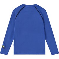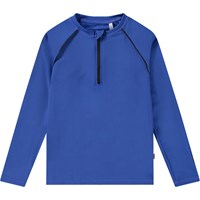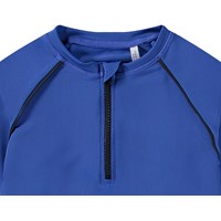 Blue rashguard for active children made from recycled polyester with UV protection 50+. The rashguard has a close fit, stand-up collar, front zip closure, and long raglan sleeves. It is comfortable to wear in the stretchy material. The product is CE-marked and tested according to standard EN-13758-1.