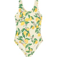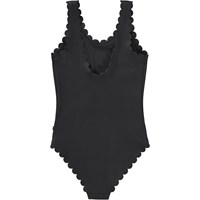 Black swimsuit for active children, made from recycled polyester with UV protection 50+. It has a comfortable, regular fit, is fully lined, and has decorative wave edges. The deep back and the narrow, adjustable straps that cross at the back ensure optimal freedom of movement and fit.