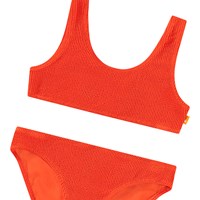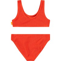 Stretchable red bikini in textured pattern with UV protection 50+. The bikini has a wide top, wide straps, deep back, and is fully lined. The bottom has elastic at the waist, a regular fit, and is also fully lined. The product is CE-marked and tested according to standard EN-13758-1.