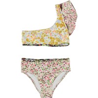 Nola is an asymmetrical bikini in a small floral print in two different, colours. The bikini top has a wide edge on the shoulder strap. The bottoms are high waisted. Molo's swimwear has 50+ UV protection. The product is CE-marked and tested according to standard EN-13758-1.