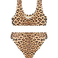 Bikini in cheetah print for active children, made from recycled polyester with UV protection 50+. The bikini has a wide top with wide straps, deep back, and soft, wavy edges at the neck and sleeves. The bottom has an elastic waist, soft, wavy edges at the legs, a regular fit, and is fully lined. The product is CE-marked and tested according to standard EN-13758-1.
